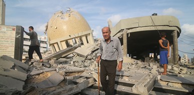 Palestinians inspect the ruins of a building destroyed in Israeli airstrikes in Khan Younis in the southern of Gaza strip, on October 8, 2023. | By Palestinian News & Information Agency (Wafa) in contract with APAimages, CC BY-SA 3.0