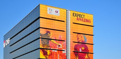 Qatar National Bank building with Qatar 2022 world cup promotion, Doha, Qatar @ iStock