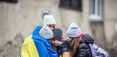 @Shutterstock - Ukrainian woman holds her three children, sad from being forced to flee their home country and become refugees.