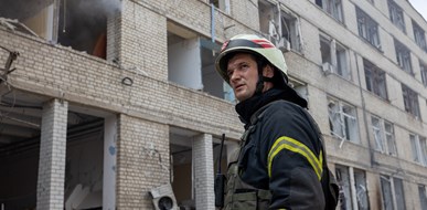 Photo by David Peinado from Pexels - Firefighter in front of a residential building destroyed by shelling