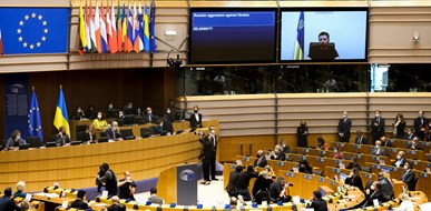 @Shutterstock - Ukrainian president Zelenskiy addresses the European Parliament after the Russian invasion of Ukraine, in Brussels, Belgium March 1, 2022.