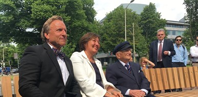 Photo @Christophe Paulussen - Don Ferencz, The Hague’s Deputy Mayor Saskia Bruines and Benjamin Ferencz at the ‘Law Not War’ bench in The Hague in 2018.