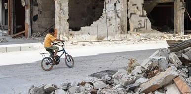 @Shutterstock - Boy riding a bicycle among destroyed houses in Homs, Syria.
