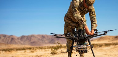 Army Capt. Eric Tatum assigned to the Army Futures Command's Artificial Intelligence Integration Center, conducts field testing with the Inspired Flight 3 Drone during Project Convergence 2022 at Fort Irwin, Calif., Oct. 27, 2022.