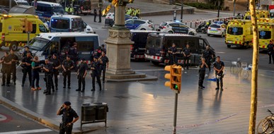 Police officers and medics gather after a terrorism attack in Barcelona (Spain) in 2017. Picture taken from Wikimedia.