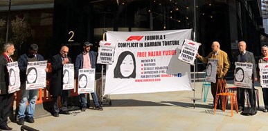 Bahraini protesters in London urge Formula One to free Najah Yusuf's. © Bahrain Alyoum news blog.