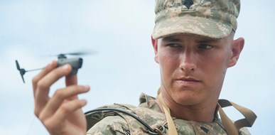 U.S. Army Spc. Logan Fishburn, 2nd Battalion, 27th Infantry Regiment, 3rd Brigade Combat Team, 25th Infantry Division, tests a PD-100 unmanned aerial vehicle during the Pacific Manned Unmanned. Photo by Staff Sgt. Christopher Hubenthal - Public Domain