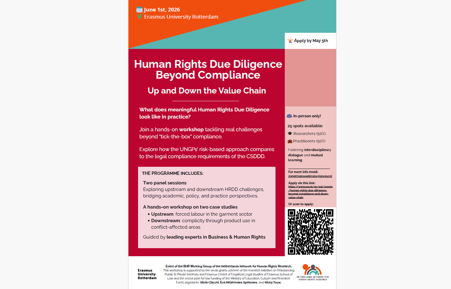 This event is organised by the Business and Human Rights Working Group of the Netherlands Network for Human Rights Research (NNHRR). It is supported by the small grants scheme of the research initiative on Rebalancing Public & Private Interests, the Erasmus Center of Empirical Legal Studies (Erasmus School of Law), and the sector plan for law funding of the Ministry of Education, Culture and Research.
