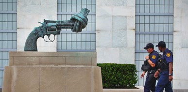 NEW YORK, US - Aug. 24, 2016: Non-violence sculpture The Knotted Gun at the United Nations Headquarters @Shutterstock