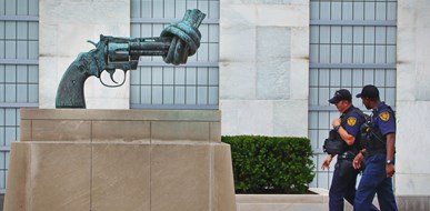 NEW YORK, US - Aug. 24, 2016: Non-violence sculpture The Knotted Gun at the United Nations Headquarters @Shutterstock